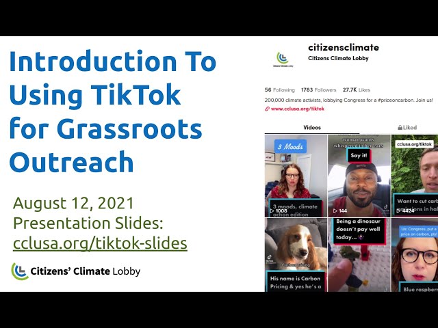 Join CCL's Media Manager Ashley Hunt-Martorano for a training on TikTok. This session will introduce you to the platform, including CCL's active channel ([@citizensclimate](https://www.tiktok.com/@citizensclimate)), and enhance your group's use of TikTok to achieve social media goals and interact with millions of users.